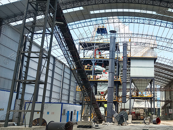 原料經(jīng)過(guò)電子秤進(jìn)入到皮帶輸送機(jī)中,由全封閉的提升機(jī)將物料入到五孔碾磨制砂機(jī)內(nèi)進(jìn)行破碎處理,再由空氣篩對(duì)破碎后的物料進(jìn)行篩分、選粉處理,篩分后的較大物料會(huì)返回五孔碾磨制砂機(jī)中進(jìn)行二次破碎,符合要求的砂子則經(jīng)加濕拌合機(jī)處理后由傳送帶輸送至成品倉(cāng)中;篩分過(guò)程中的粉塵會(huì)經(jīng)粗細(xì)粉分離機(jī)進(jìn)入到布袋收塵器內(nèi),而其中較大的粗顆粒會(huì)在粗細(xì)粉分離機(jī)的作用下,按需求在成品砂中進(jìn)行回?fù)?,?xì)粉塵將通過(guò)風(fēng)力進(jìn)入到布袋收塵器,作為副產(chǎn)品進(jìn)行使用。